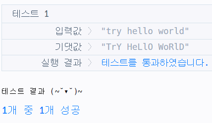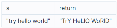 "try hello world"는 세 단어 "try", "hello", "world"로 구성되어 있습니다. 각 단어의 짝수번째 문자를 대문자로, 홀수번째 문자를 소문자로 바꾸면 "TrY", "HeLlO", "WoRlD"입니다. 따라서 "TrY HeLlO WoRlD" 를 리턴합니다.