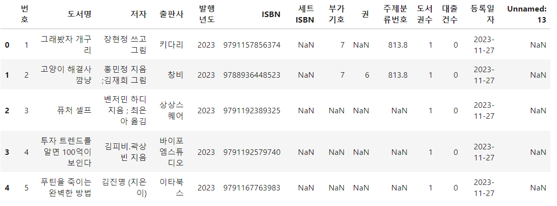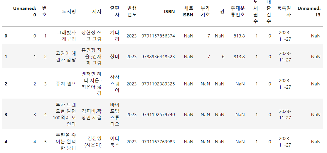 df = pd.read_csv('서울특별시교육청남산도서관 장서 대출목록 (2023년 11월).csv', encoding='EUC-KR', low_memory=False)