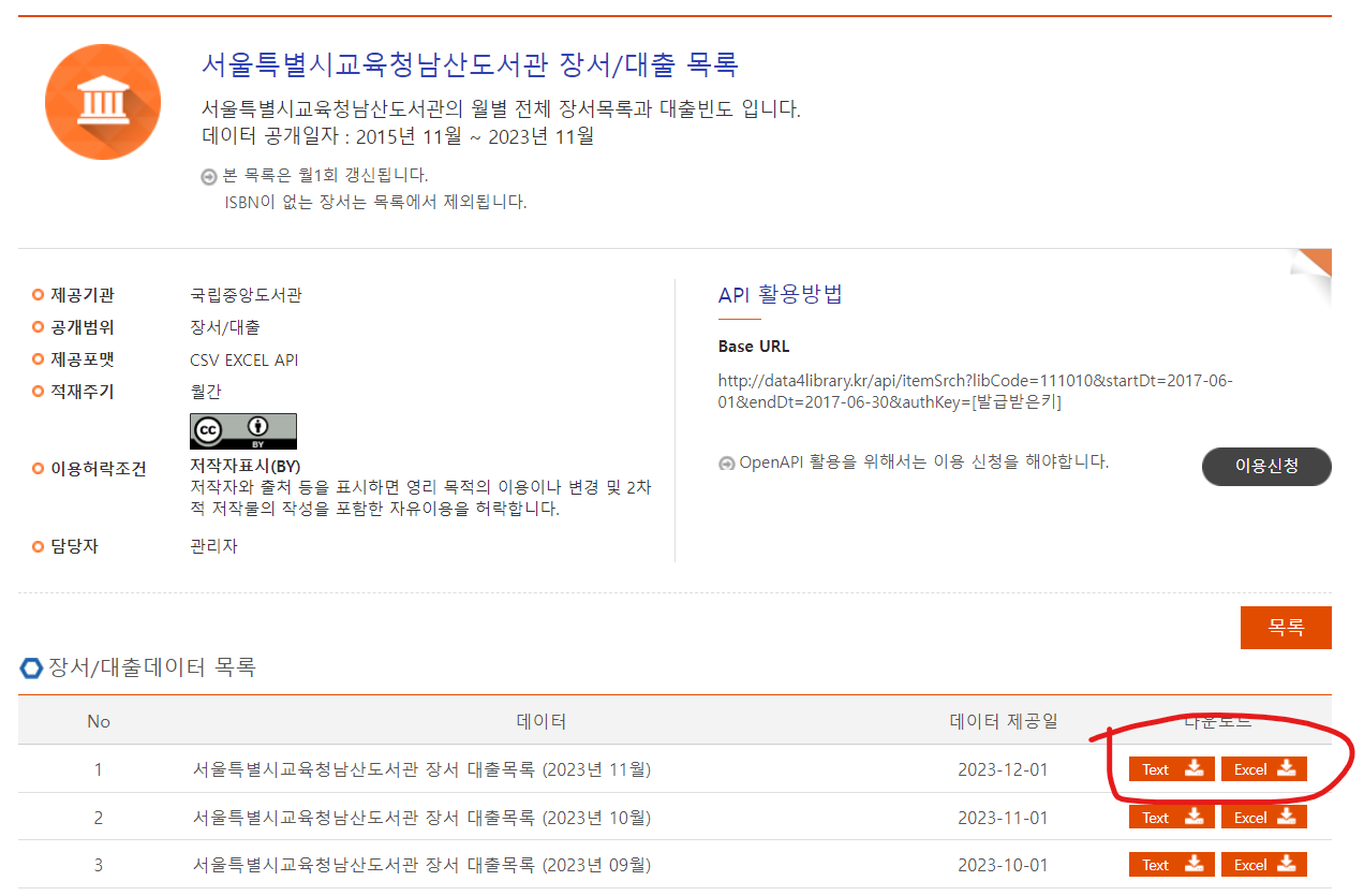 가장 인기가 많은 도서를 찾기 위해 도서관 정보나루 홈페이지에서 서울특별시교육청남산도서관 장서 대출목록 (2023년 11월).csv를 다운 받아주도록 하겠습니다.