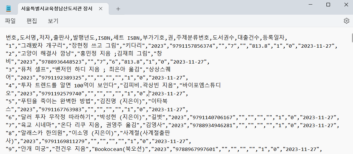 with open('서울특별시교육청남산도서관 장서 대출목록 (2023년 11월).csv') as f: