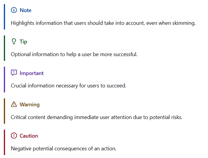 GitHub Docs에서는 일반적인 인용구(>) 문법을 확장해, 중요도나 성격에 따라 시각적으로 구분되는 박스 형태로 내용을 강조할 수 있습니다.
